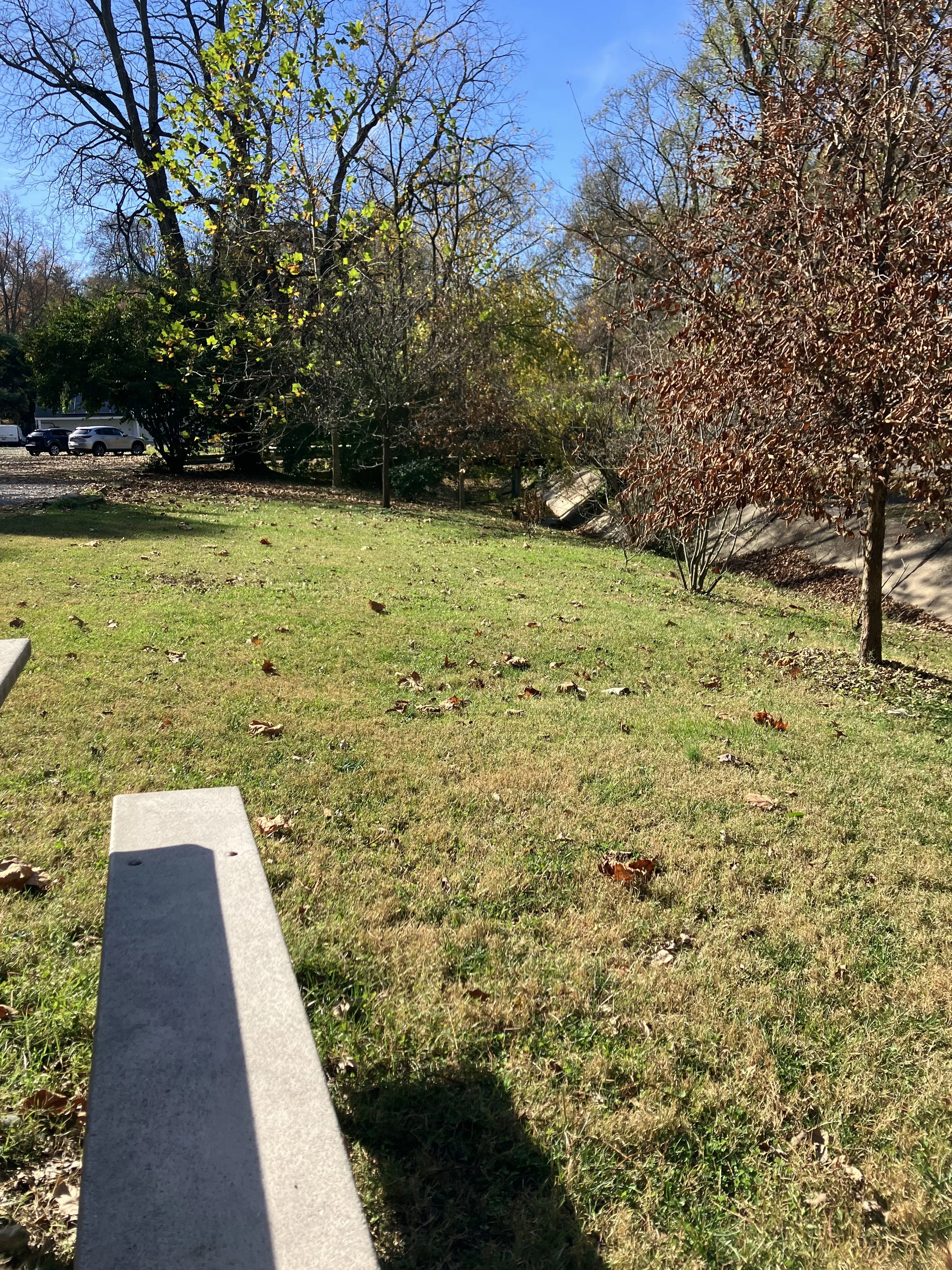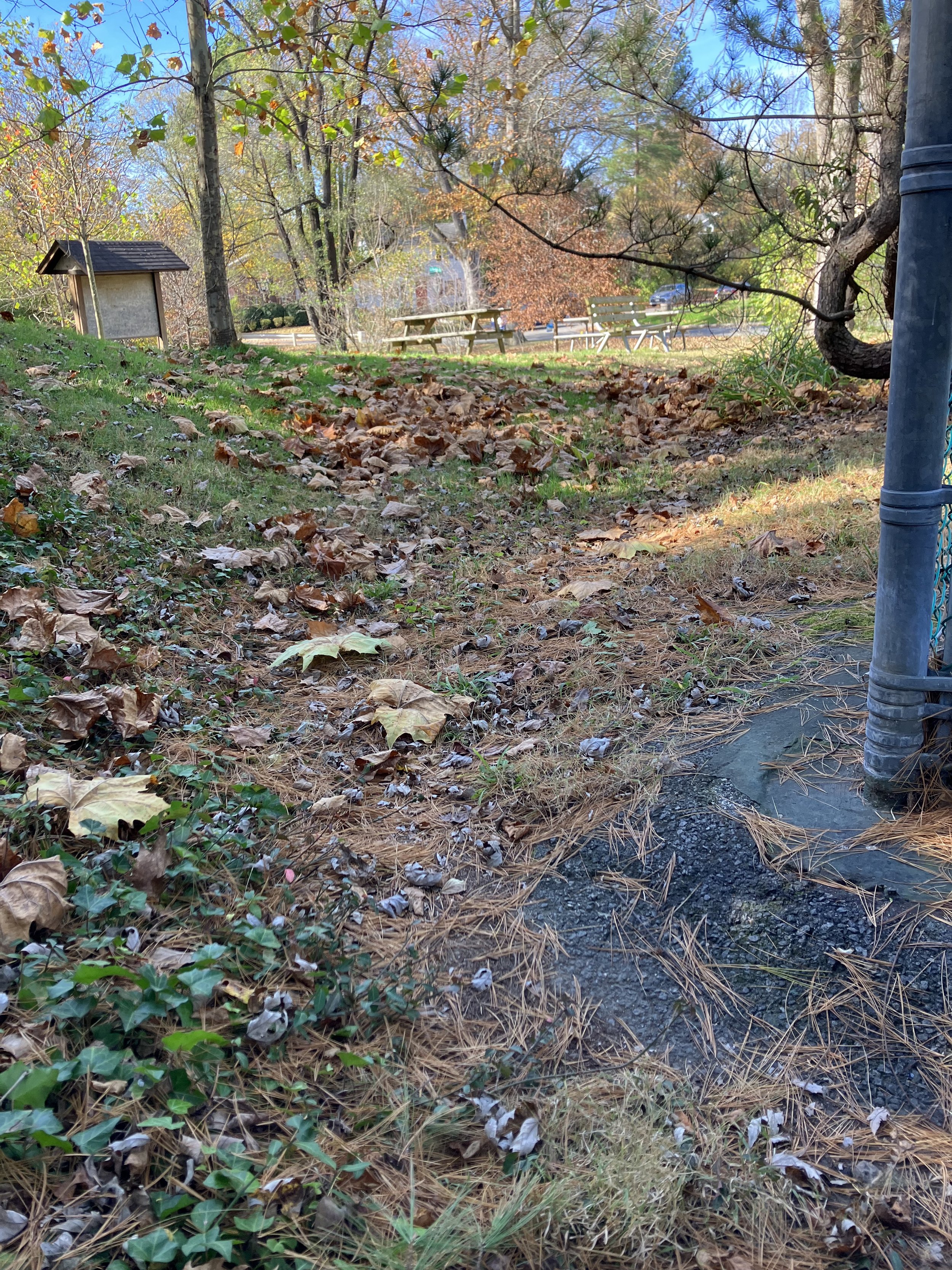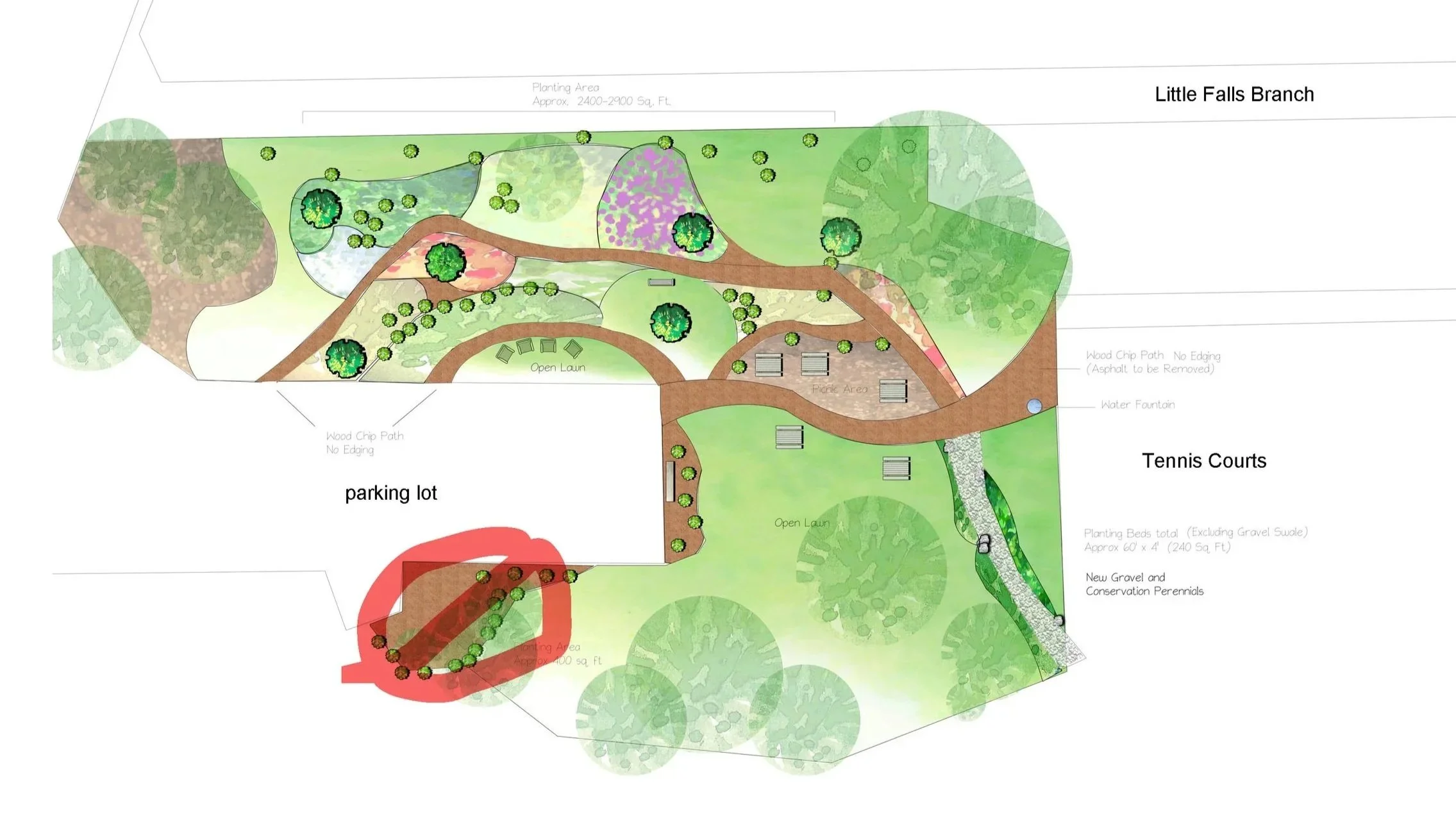 Landscaping plans for Little Falls Swim Club. Unfortunately, the area marked in red cannot be done this year as it is infested with the extremely aggressive and non-native lesser celandine. The lesser celandine has to be completely eradicated before any thing can be planted there.