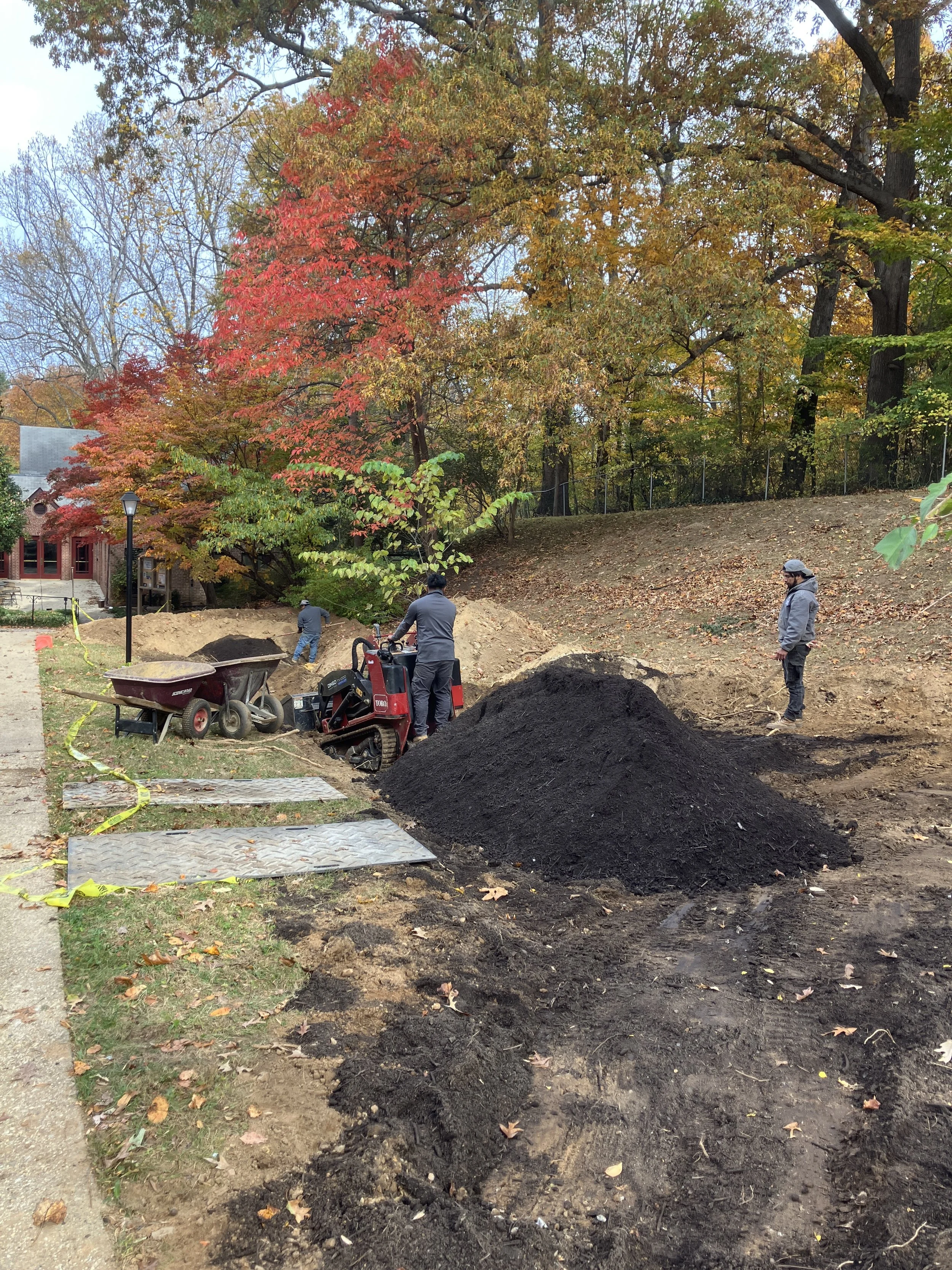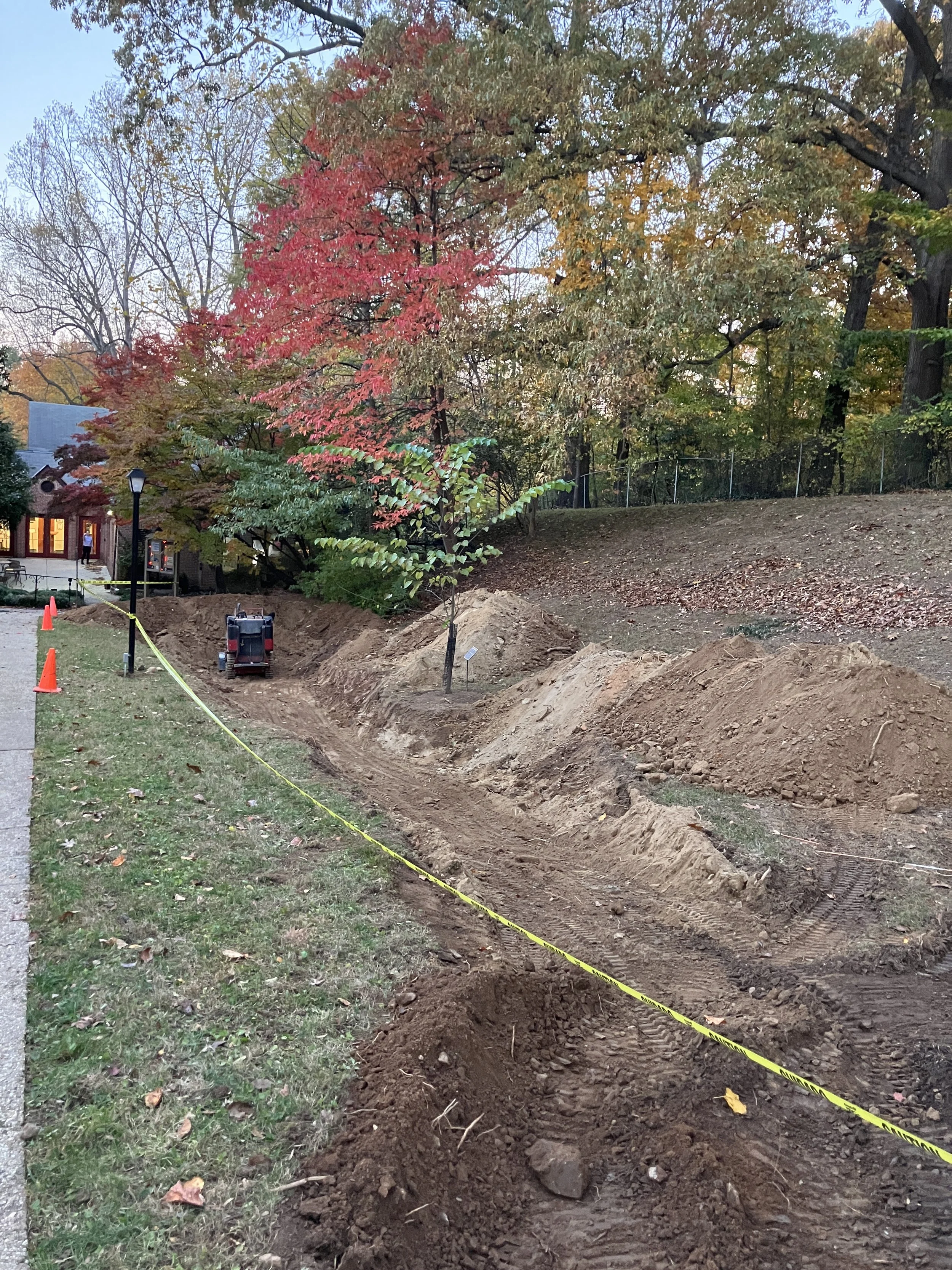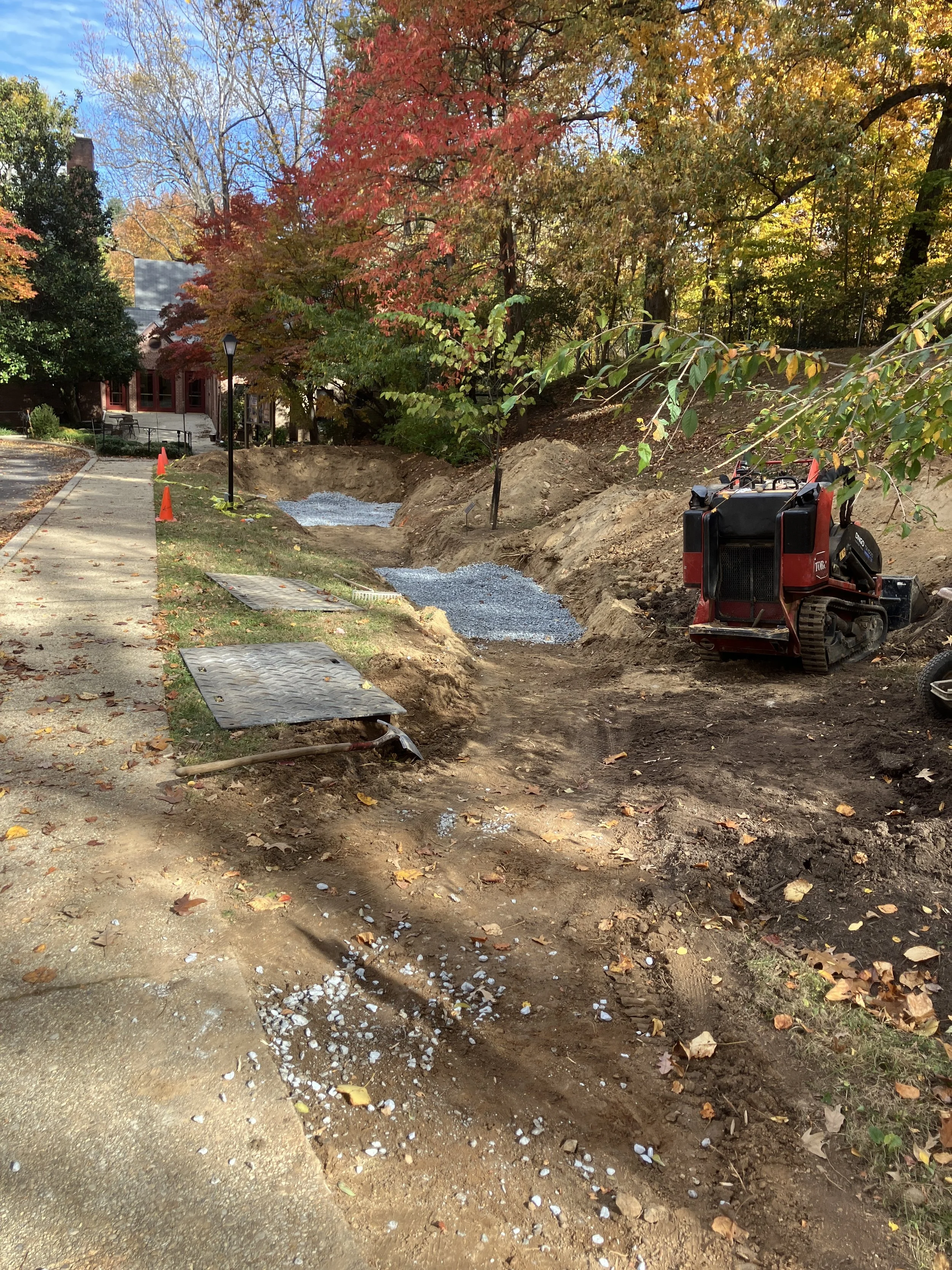 St. Dunstan’s Church in Bethesda is going native - with native plants and a rain garden! In the spring of 2025, LFWA was awarded a $75,000 grant from the grant from the Montgomery County Department of Environment Protection to install storm water management on the very hilly St. Dunstan’s Church campus in Bethesda. The grant funds a rain garden to capture and treat rain water flowing from the parking lot and adjacent grass hill, as well as extensive native planting to replace the grass on the steep hill adjacent to the new rain garden. A trench drain installed across the driveway will send water from the parking lot and paved surfaces to the rain garden via a vegetated swale.