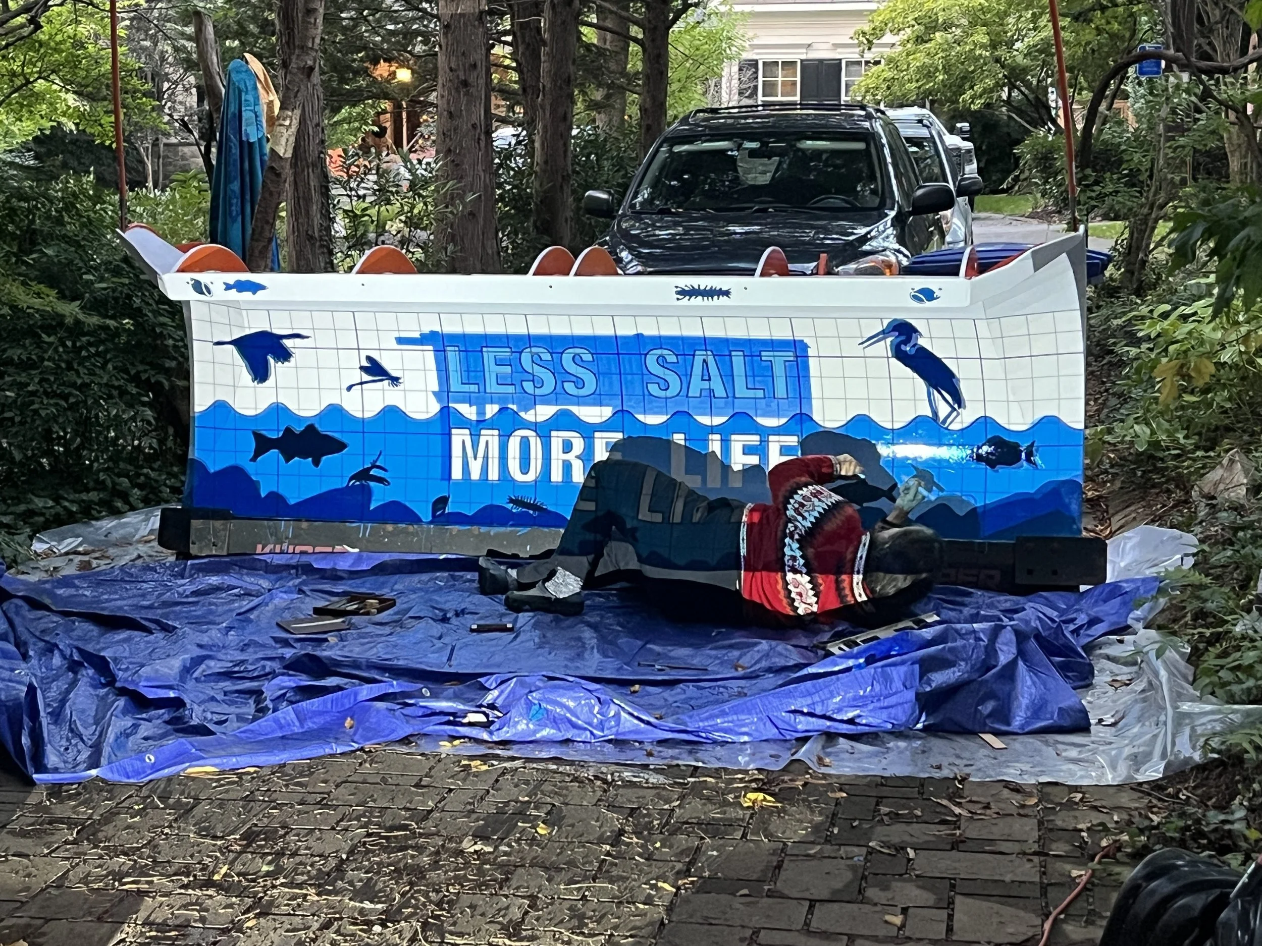 Too much road salt creates a problem for our fresh water creeks. When the snow melts, the salt washes into the storm drain system and is carried into the creek where it raises the salinity level of the water. What a better way to get the message out then to put it on the snow plows.