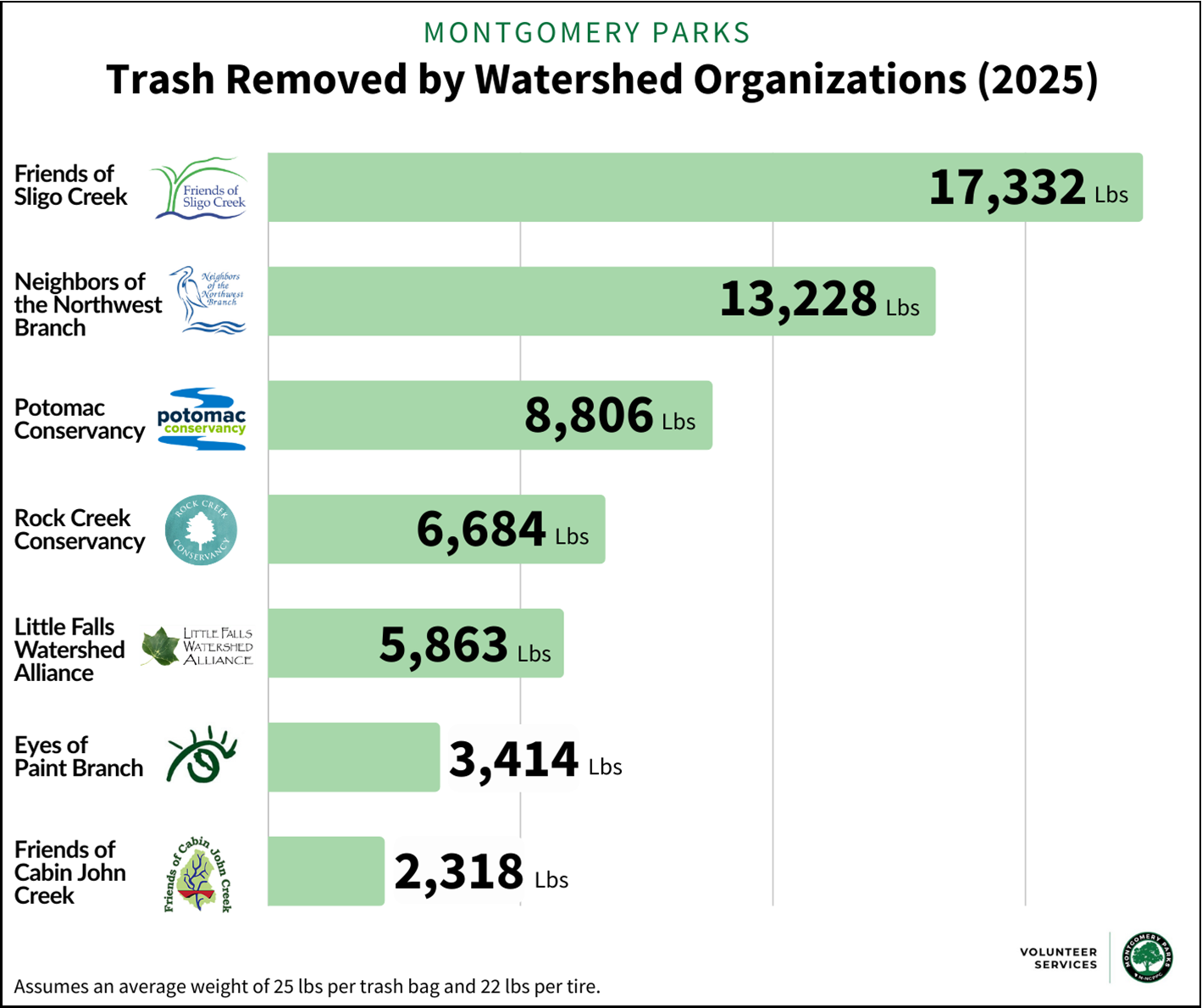 Most impressive is that we did this all despite being the smallest of the County watersheds. Montgomery Parks tracks the trash reduction efforts of five watershed groups in the county. The watersheds they steward range from small, at 9.5 square miles the Little Falls is the smallest, to quite large - the Rock Creek watershed is over 34 square miles in Montgomery County. And while we didn’t pick up the most trash, in the 18 years that we have been tracking our trash clean-up efforts, we have totaled more than 75,000 pounds. That’s trash data to brag about!
