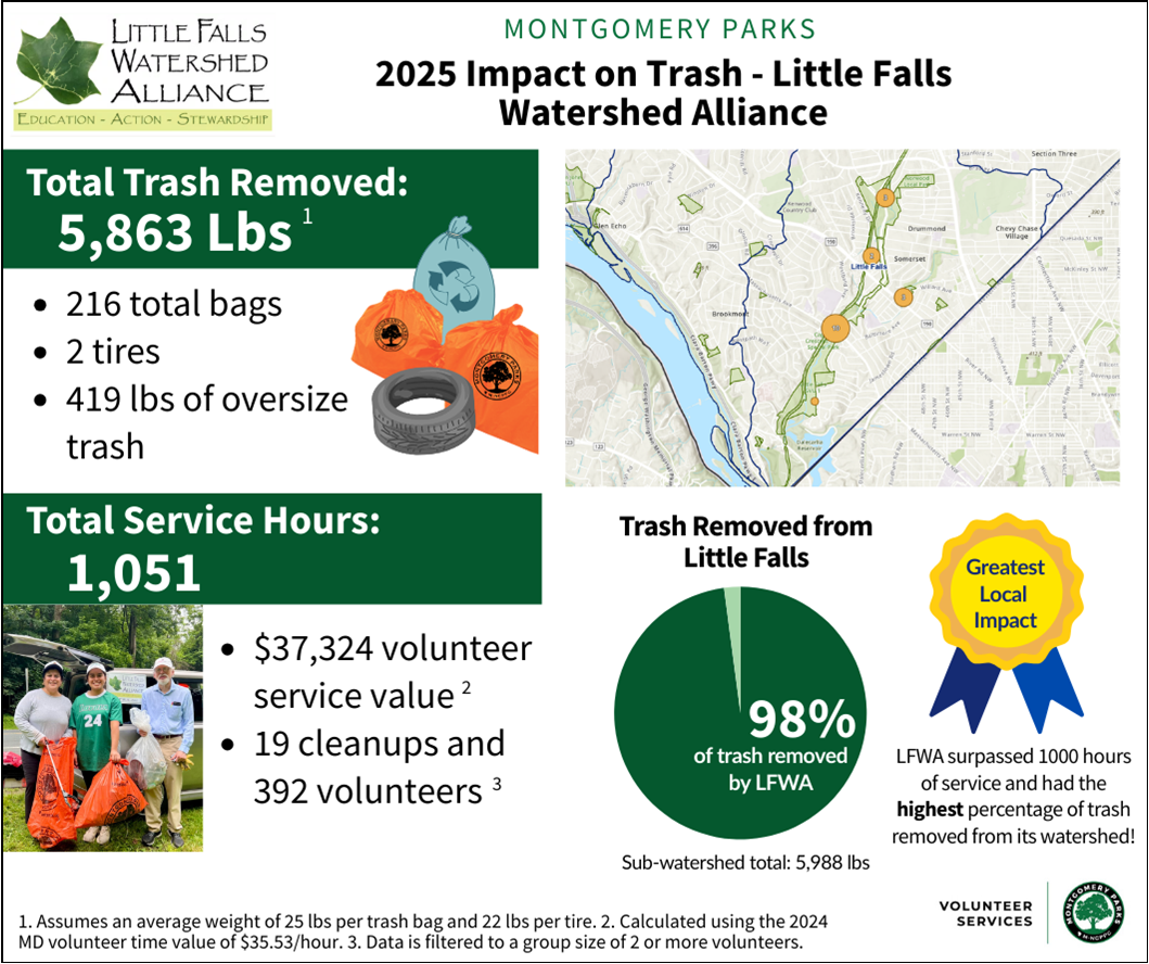 Little Falls Watershed Alliance takes second place in Montgomery Parks for the number of volunteers engaged in picking up trash - over 1,000 hours of service by 392 volunteers! Only one other watershed group in the County reached the 1,000 hours mark.